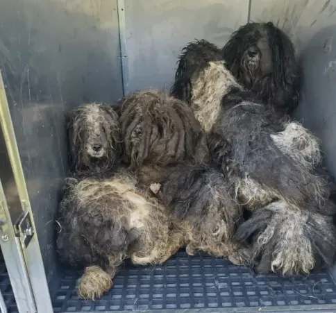The moment the crates opened, the smell of neglect filled the room. Fur was matted over eyes and twisted around paws. Dirt clung to every strand. Yet beneath it all were tender souls who had survived together.